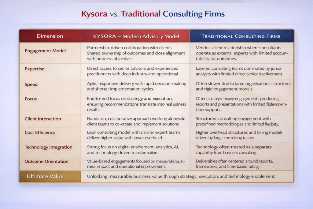Kysora Solutions represents a new generation of boutique advisory firms built for a rapidly evolving and digitally connected world. While traditional consulting models often operate in functional silos, we believe modern organisations require integrated thinking that connects strategy, operations, technology, and financial outcomes. Our approach combines deep experience with fresh perspectives—challenging conventional “old world” consulting approaches that focus primarily on analysis and static recommendations.